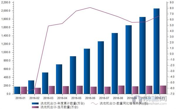 据前瞻数据库数据显示,2016年1-11月,我国洗涤机械出口量累计2055万台,同比增长6.7个百分点,出口金额30.38亿美元,同比下滑6.2个百分点,出口量呈现增长,而出口额却表现下滑,显示产品出口均价有所下滑,出口均价为147.84美元/台,价格同比下降12.05%。